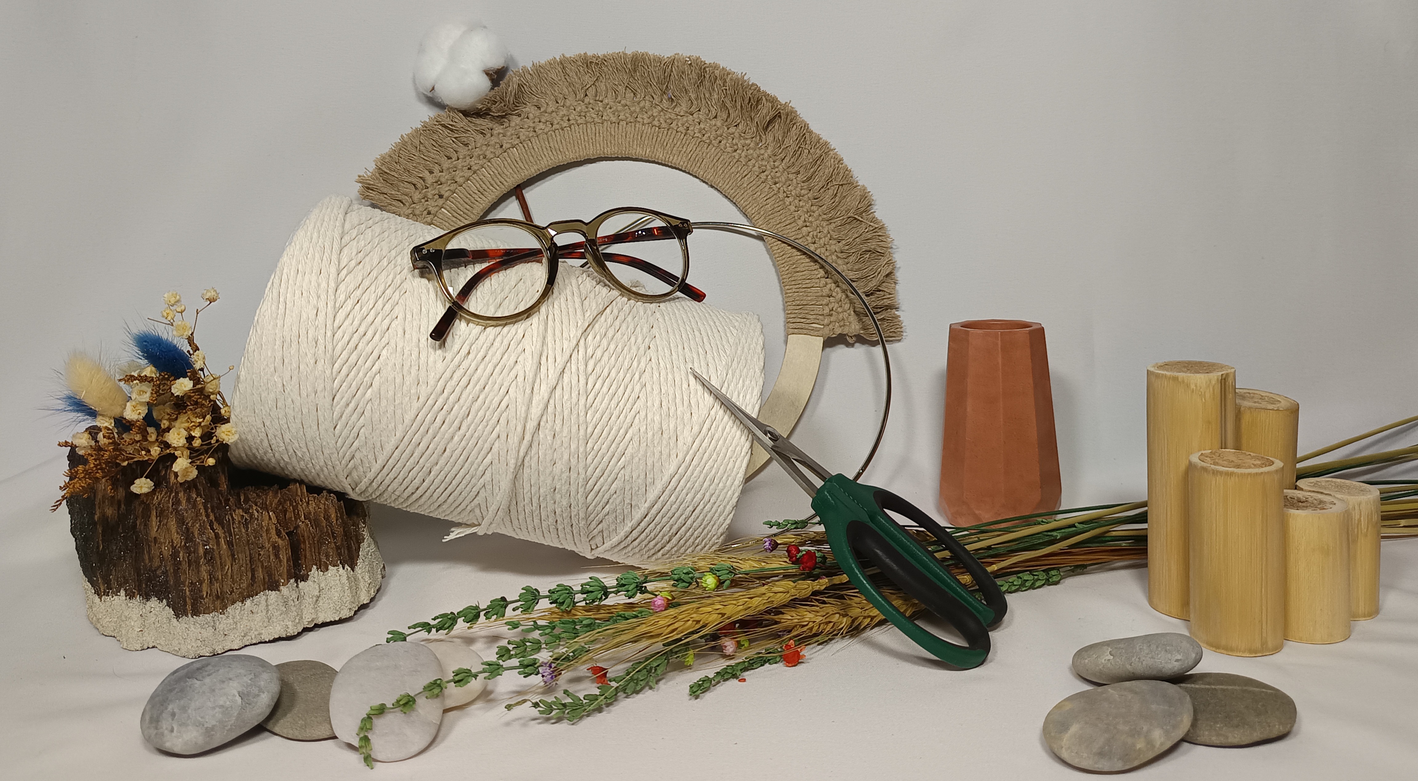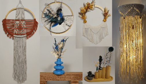 "Mes créations sont confectionnées à partir de matériaux naturels : corde en coton, fleurs séchées, bois, bambou et plâtre façonné à la main, enrichi de pigments naturels.
