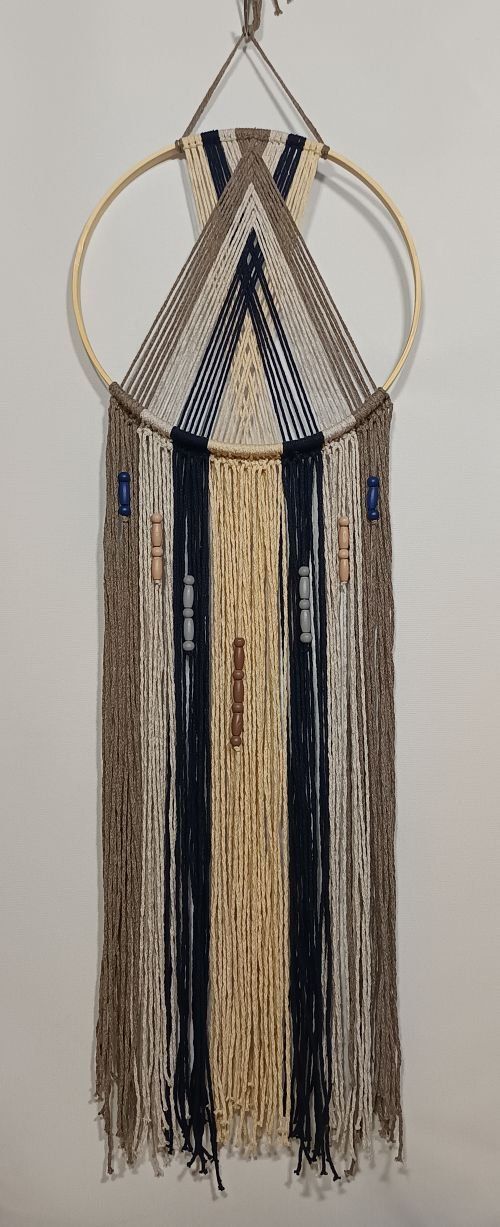 Cercle de vie composé d'un anneau en bois, macramé en coton recyclé et de perles de bois colorées.