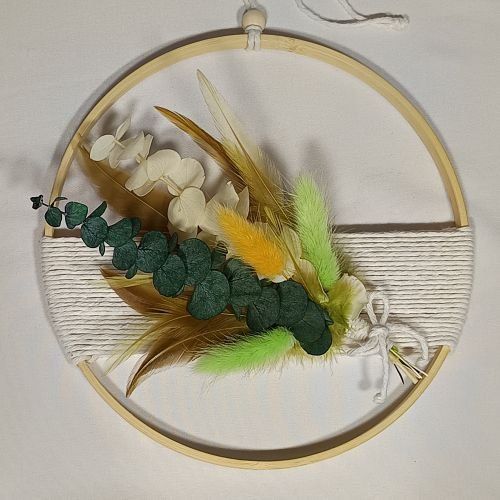 Cercle floral composé de bois, macramé coton recyclé et de fleurs séchées.