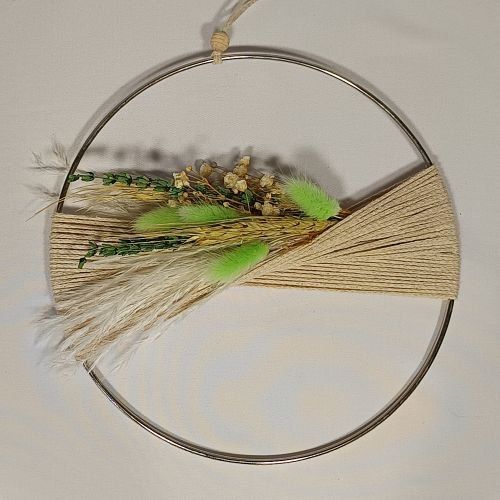 Cercle floral composé d'un anneau en fer, macramé coton recyclé et de fleurs séchées.