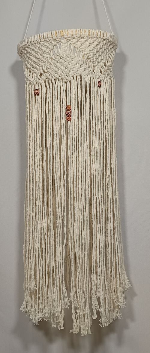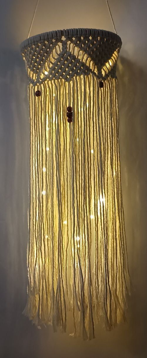Lanterne composée d'un anneau en bois, macramé en coton recyclé et de perles en bois colorées (guirlandes LED fournies, avec piles).
