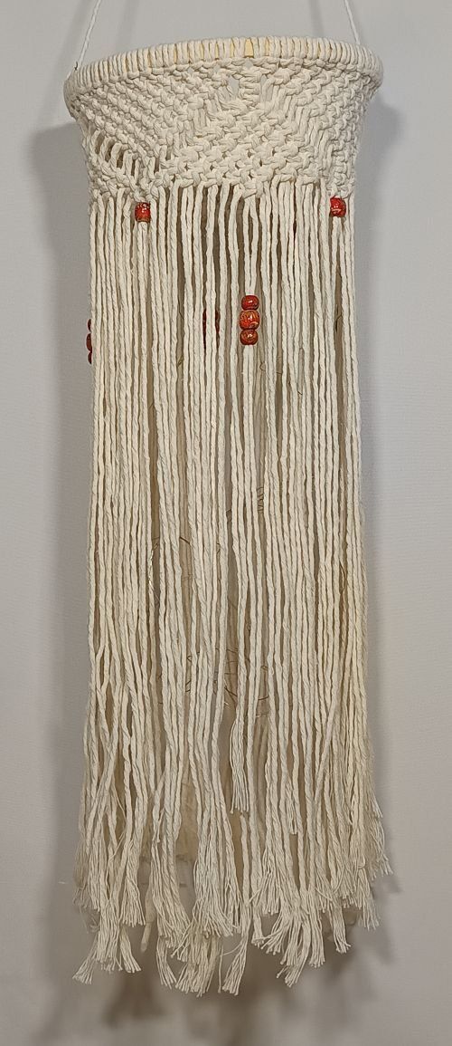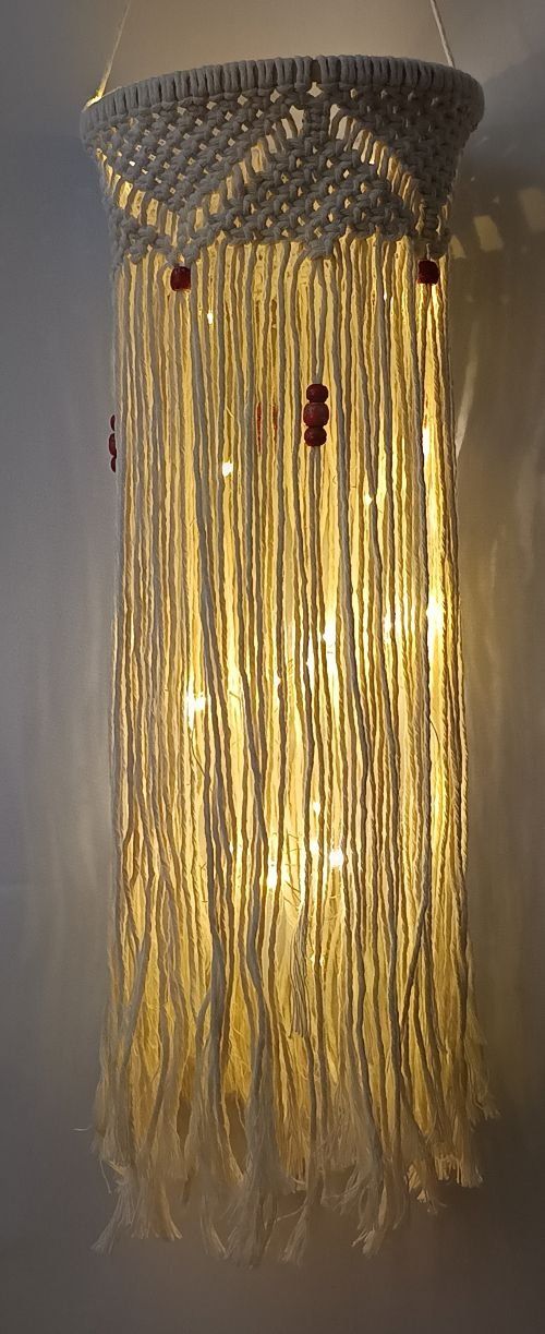 Lanterne composée d'un anneau en bois, macramé en coton recyclé et de perles en bois colorées (guirlandes LED fournies, avec piles).