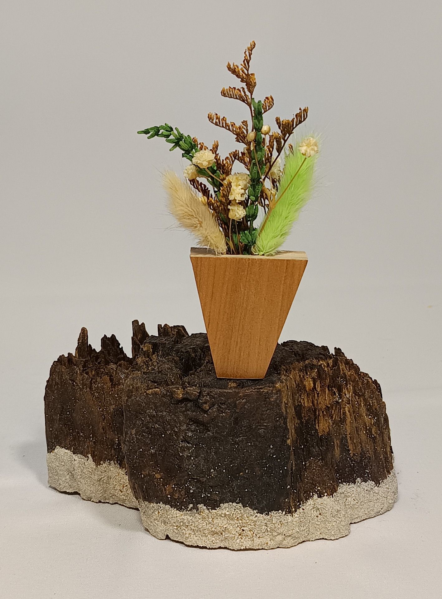 Fleurs séchées dans son petit pot en balsa plaqué vernis.