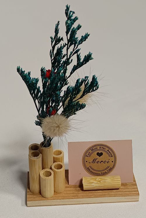 Marque place composé d'un support en balsa plaqué, de bambou et de fleurs séchées.