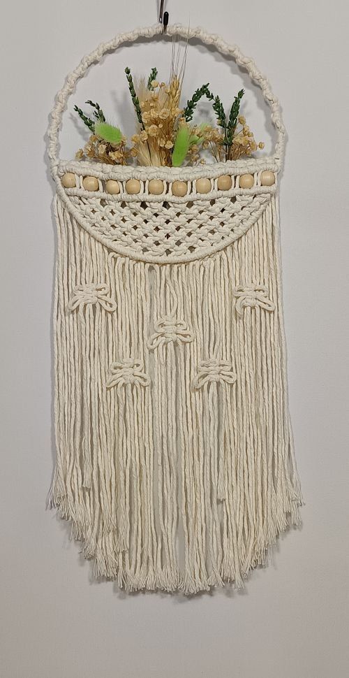 Panier floral composé d'un anneau en fer, macramé coton recyclé, perles en bois et de fleurs séchées.