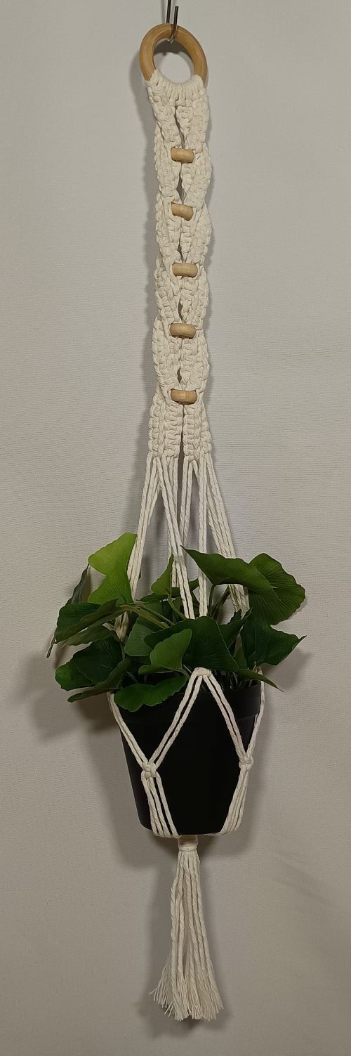 Suspension de plante composée d'un anneau en bois, de macramé en coton recyclé et de perles en bois (pot de plante non inclus).