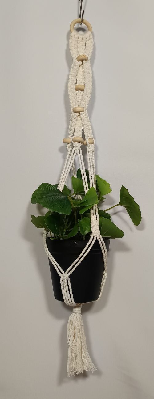 Suspension de plante composée d'un anneau en bois, de macramé en coton recyclé et de perles en bois (pot de plante non inclus).