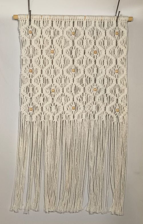 Tenture composée d'un support en bois (inclus à l'achat), macramé en coton recyclé et de perles en bois.